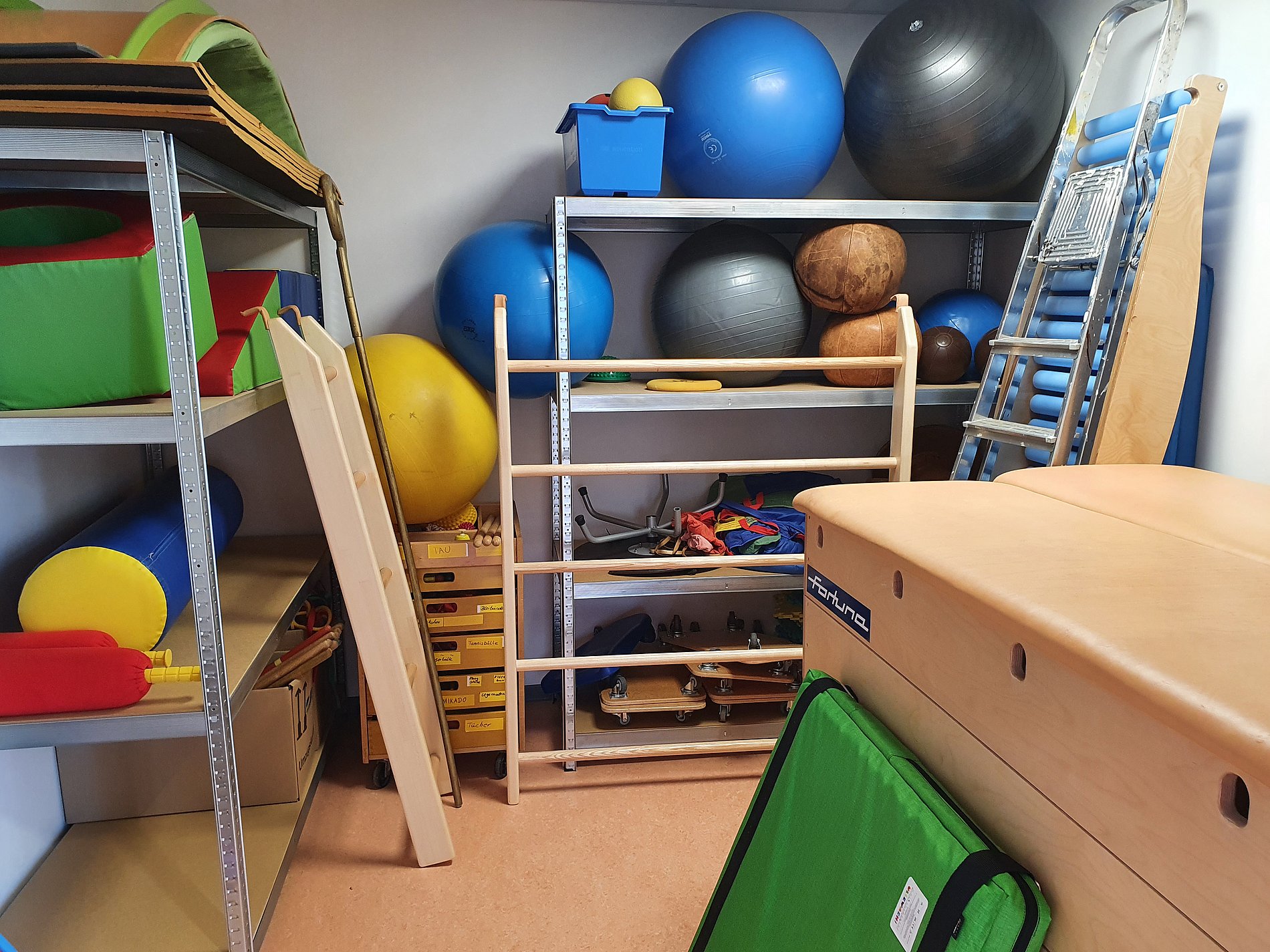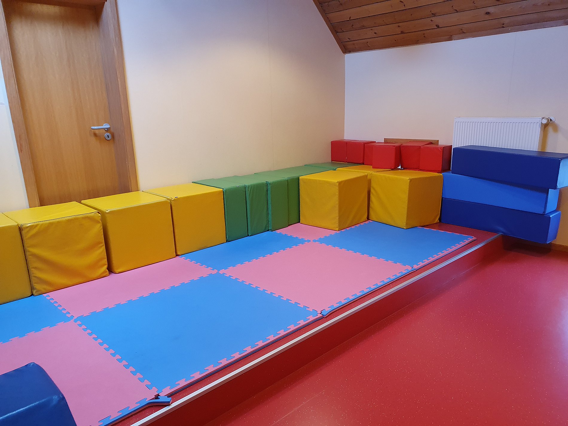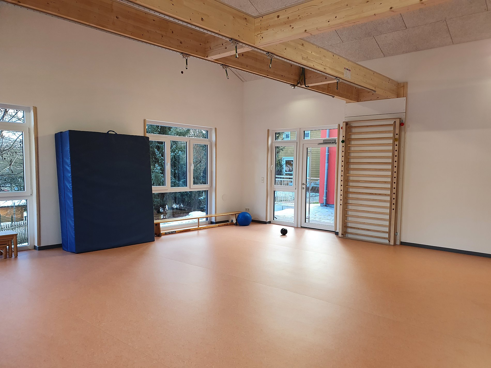 Direkt gegenüber der Krippengruppe befindet sich die Turnhalle, die regelmäßig für Bewegungsangebote der jeweiligen Gruppen genutzt wird. Durch das Schienensystem und die neigbare Sprossenwand haben wir vielfältige Möglichkeiten, den Raum auch in der Höhe nutzen zu können.