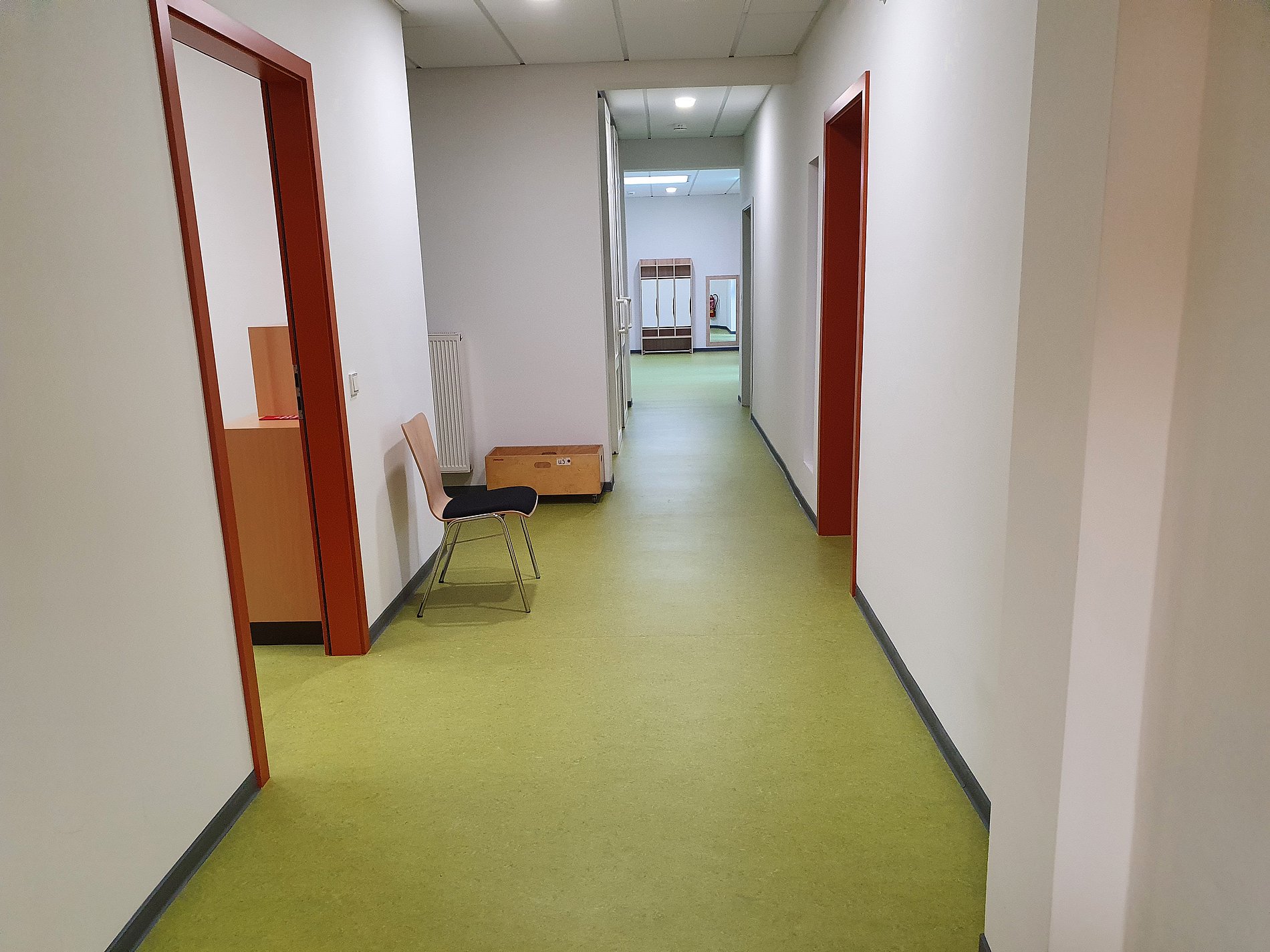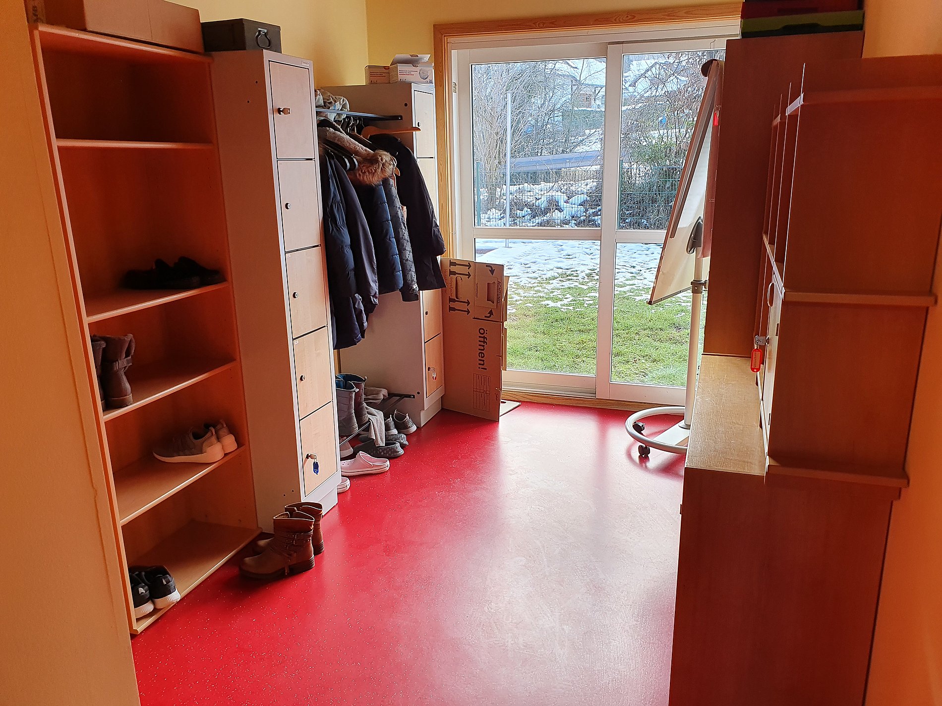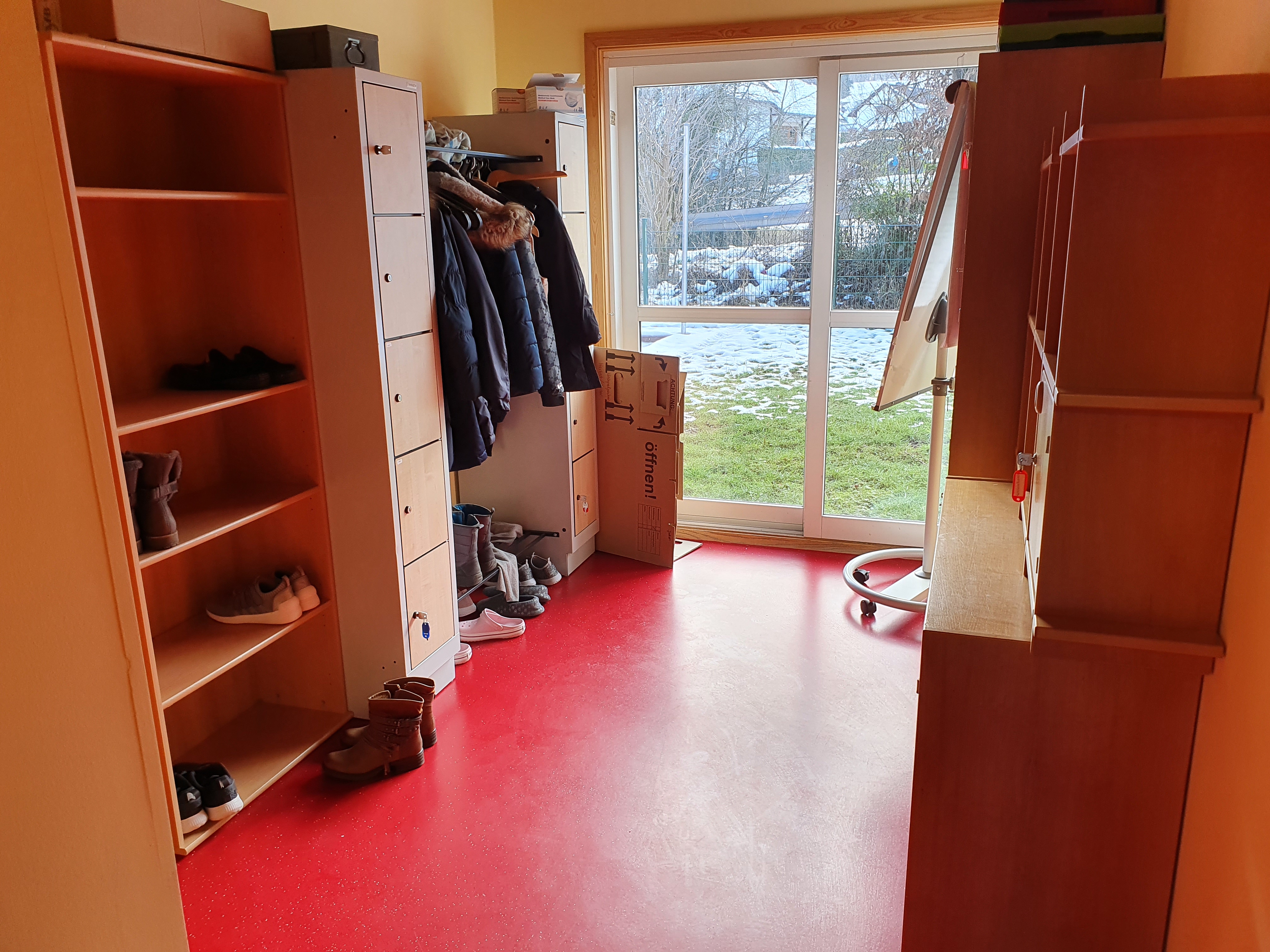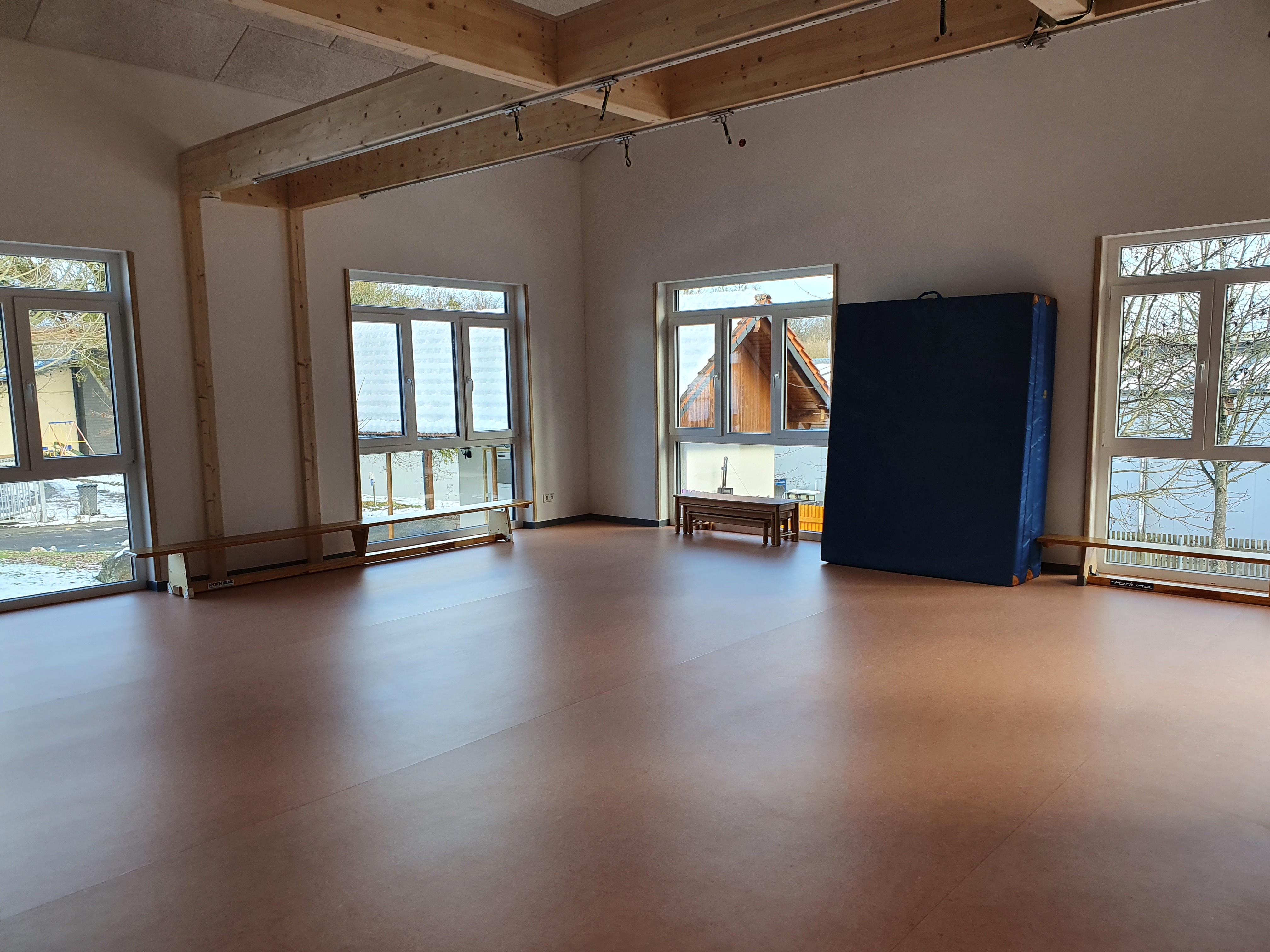 Wenn Sie von der Eingangstür nach links abbiegen, gelangen Sie in den Neubau, in dem sich die Mensa, das Büro, der Personalraum, der Schlafraum, die Krippengruppe sowie der Turnraum befindet.