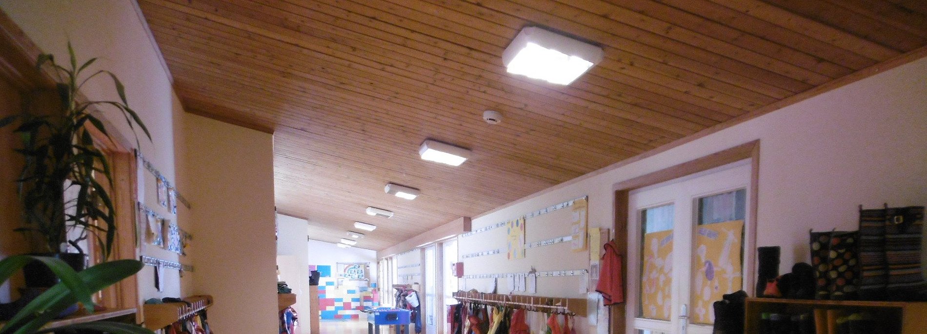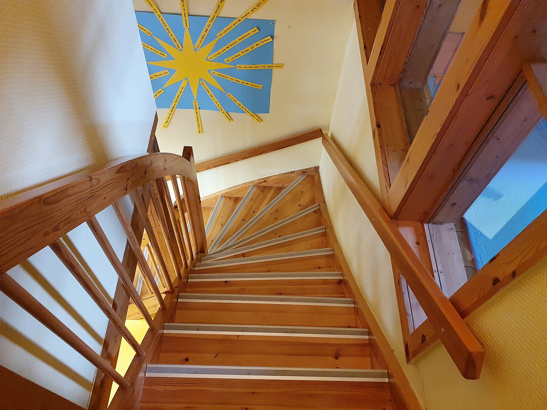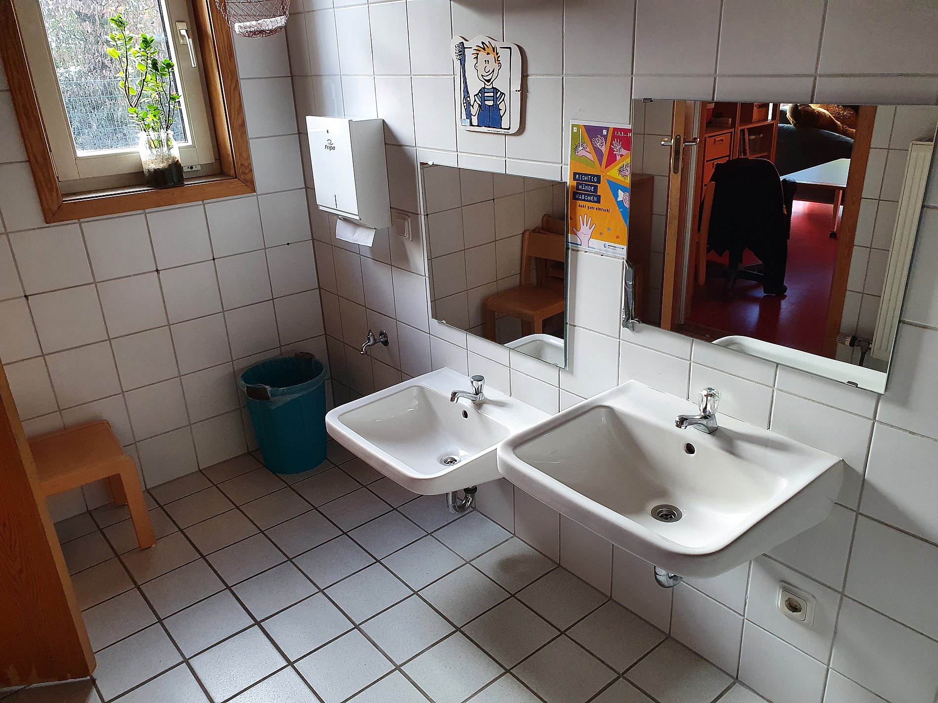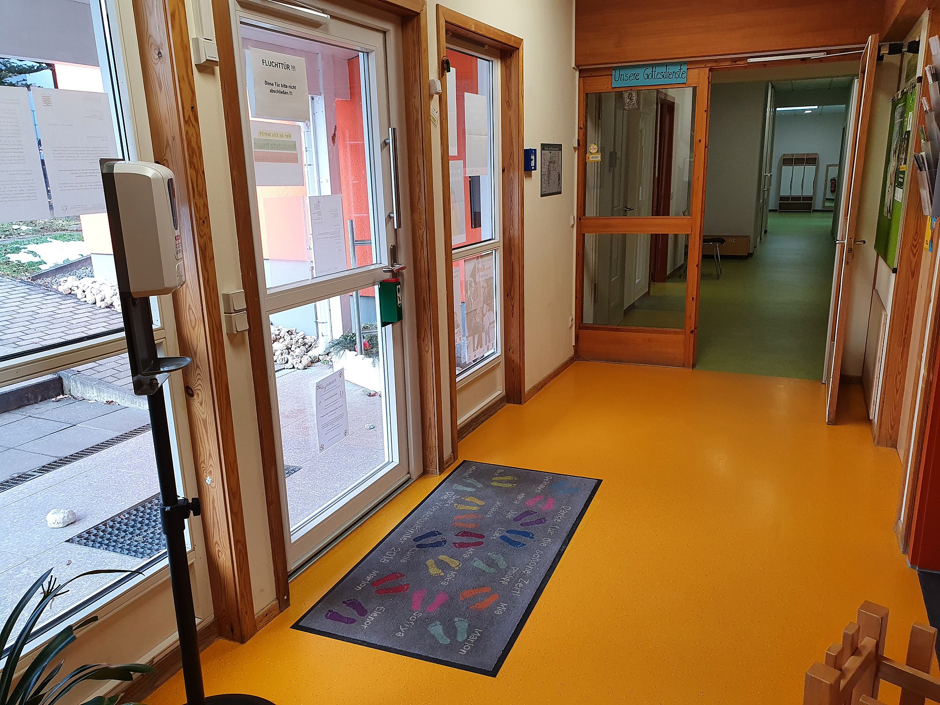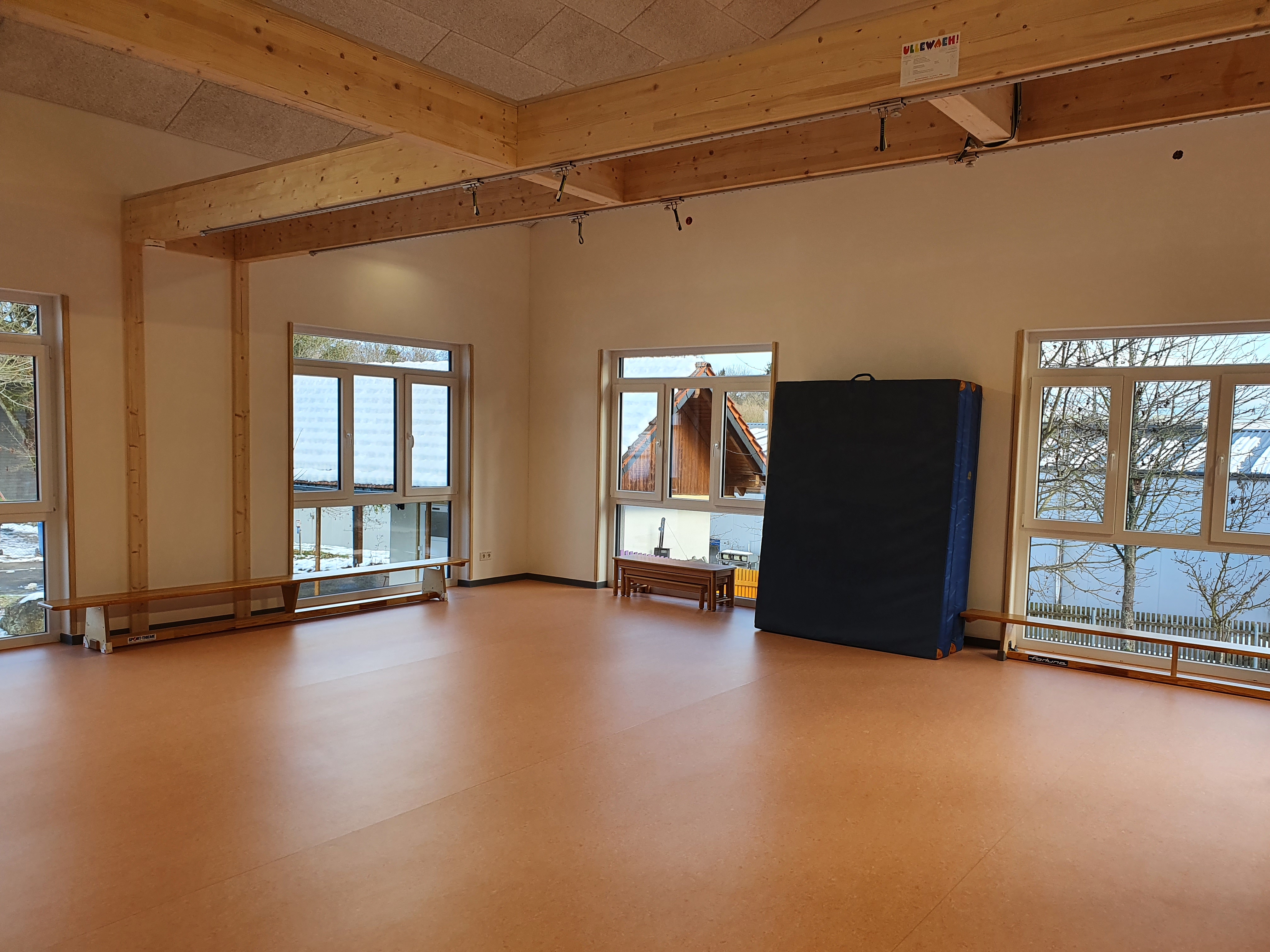 Wenn Sie von der Eingangstür nach links abbiegen, gelangen Sie in den Neubau, in dem sich die Mensa, das Büro, der Personalraum, der Schlafraum, die Krippengruppe sowie der Turnraum befindet.
