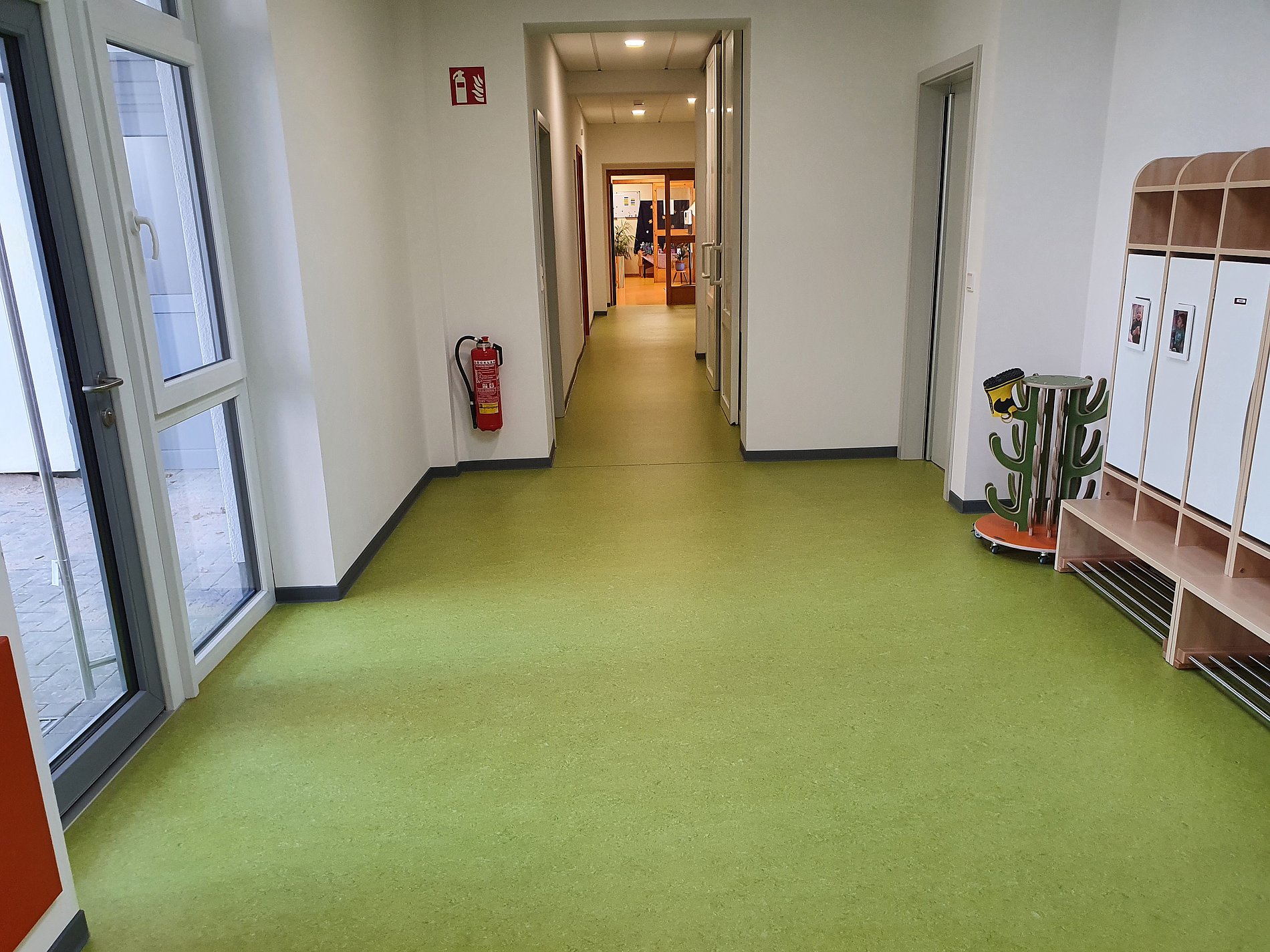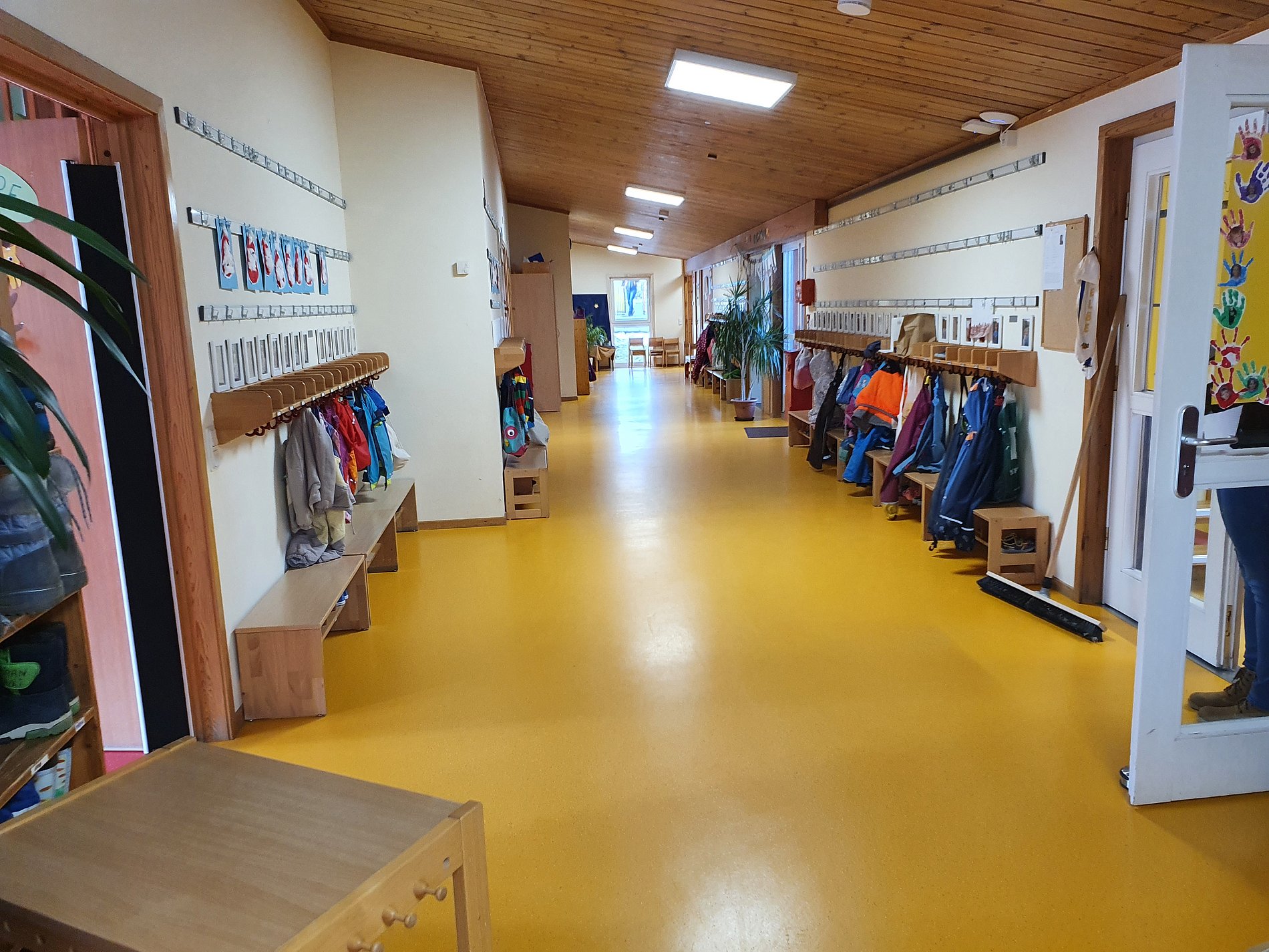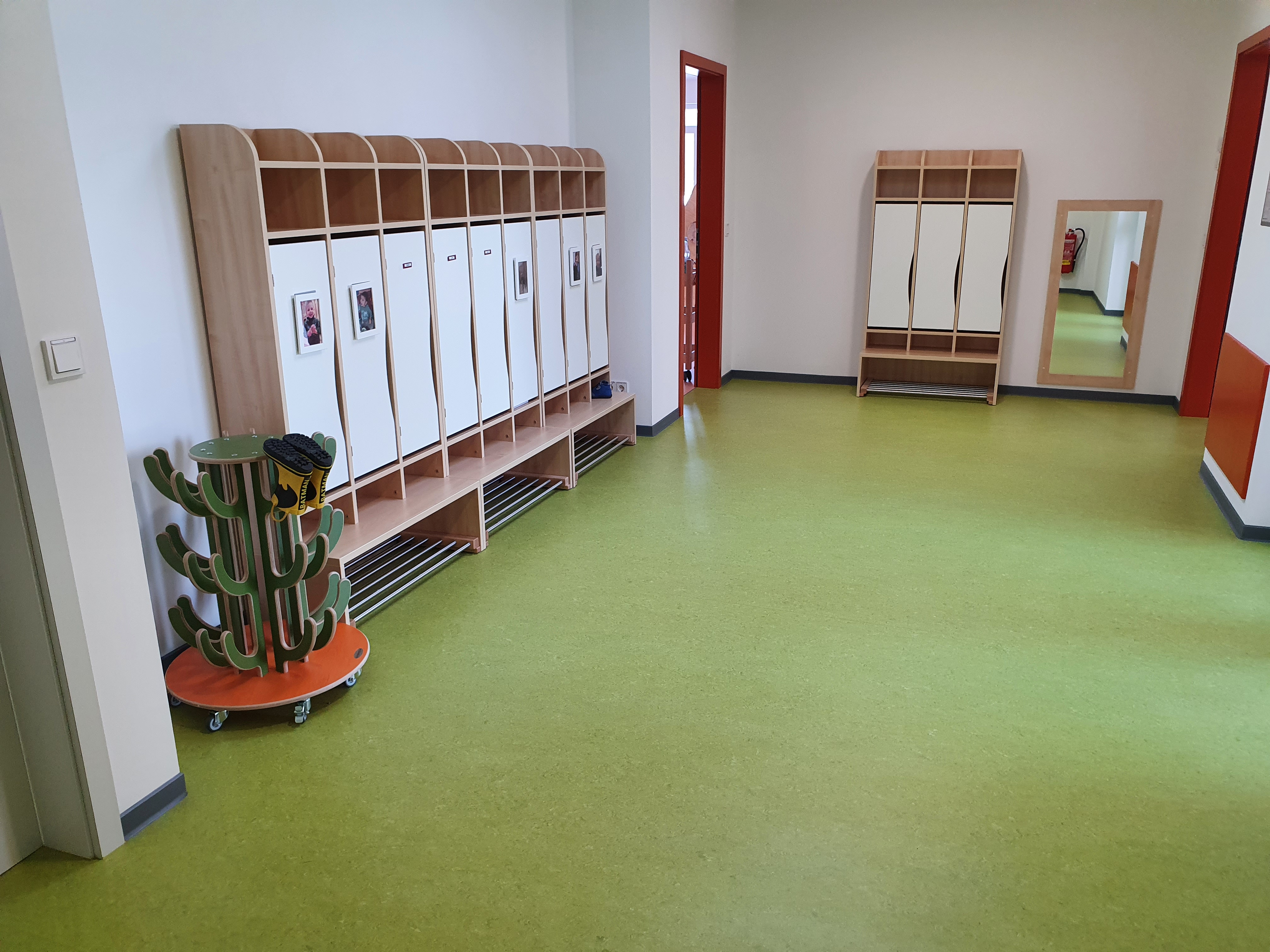 Wenn Sie von der Eingangstür nach rechts abbiegen, kommen Sie in unseren langen Spielflur, von dem die einzelnen Gruppenräume abgehen.