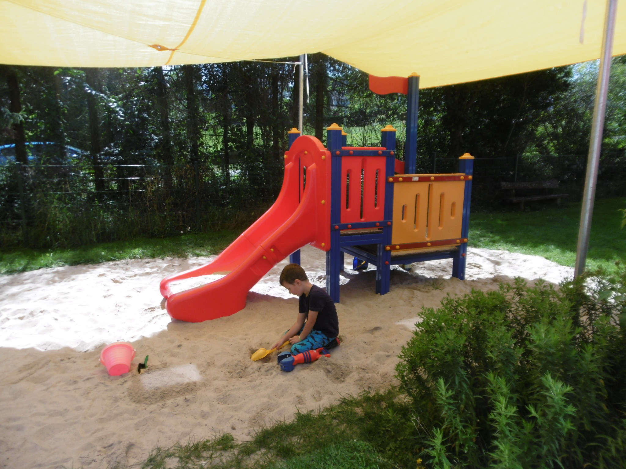 Unser Außengelände ist sehr groß! Die Kinder haben die Möglichkeit zu Rutschen, im Sandkasten zu spielen, auf einem Karussell zu fahren, zu wippen, zu schaukeln, Fußball zu spielen, sich in Büschen oder im Tunnel zu verstecken und vieles mehr. Die großen Bäume bieten das ganze Jahr über die Möglichkeiten, die Natur zubeobachten und bieten im Sommer viel Schatten.