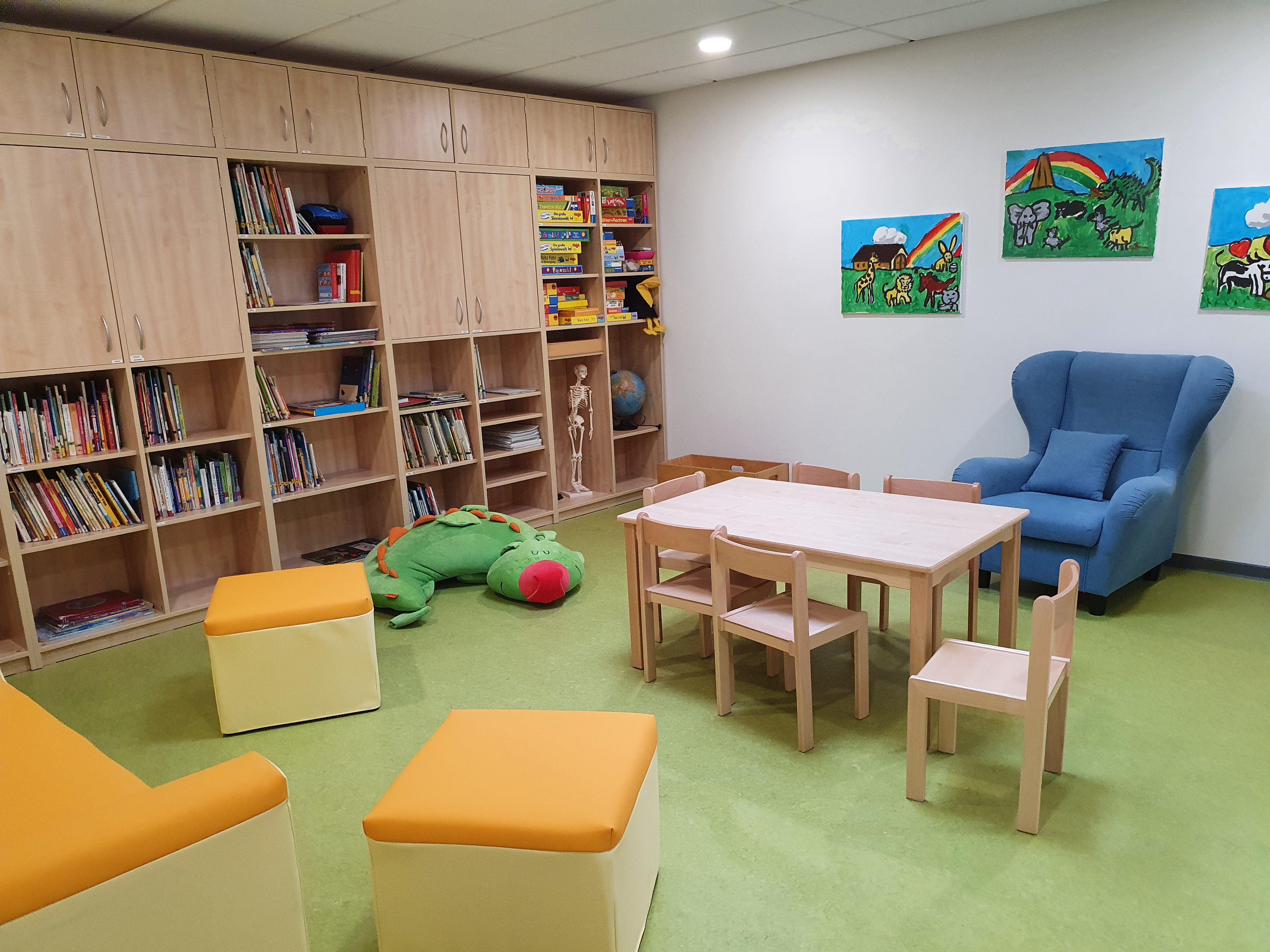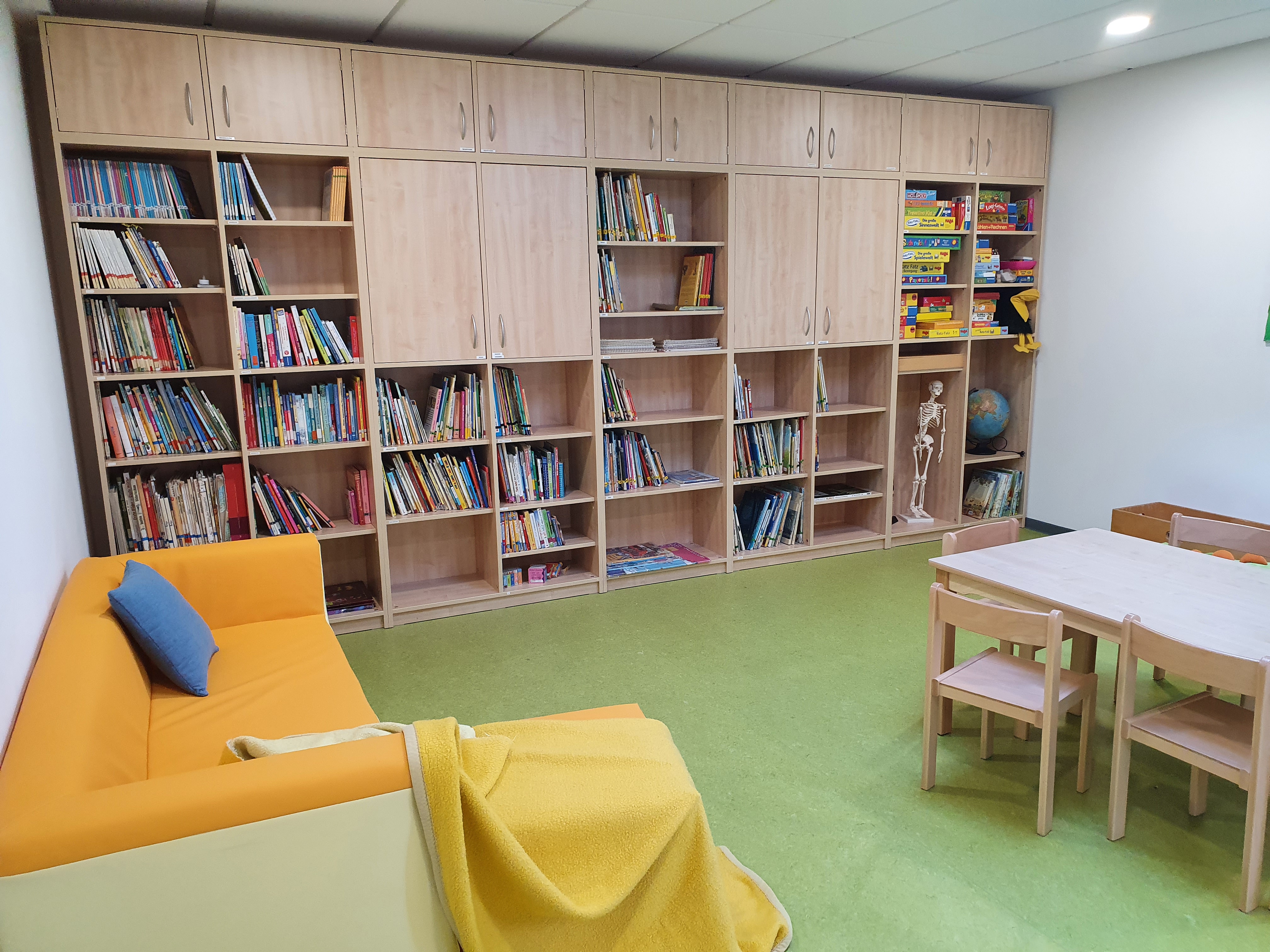 Die Bibliothek ist unser "Ruhe-Raum". Die Kinder haben hier die Möglichkeit, sich zurückzuziehen und sich ein Buch anzuschauen oder auch vorgelesen zu bekommen.